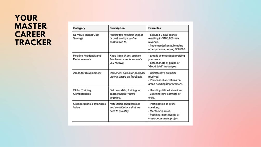 This should serve you as a starting point to build your case for the next job promotion and stay on top of your impact and performance.